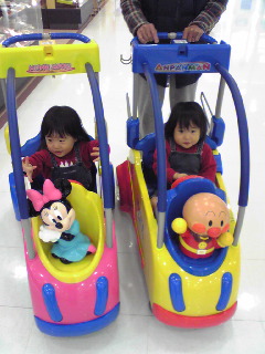 運よく?アンパンマンが1台とミニーちゃんを借りられました。二人はアンパンマンアンパンマン!と大喜びでハンドルを握り売り場を乗り回しました♪
